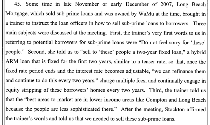 This was, at the time, not only a "groundbreaking" analysis, it was entirely correct. Subprime mortgage lenders were infesting minority zip codes at an unprecedented pace with precisely that scenario in mind. And as we know the 2010 testimony of former Washington Mutual loan officer Greg Saffer, the first thing you learn in equity stripping academy is "not to feel sorry for 'these' people."