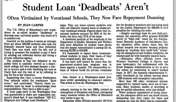 But to the credit of the American legislature of the day, the majority of its members were still capable of distinguishing between PR and reality. It concluded its round of hearings in February 1976 bypostponing the vote on the non-dischargeability amendment pending a formal Government Accounting Office study on the matter, which in turn confirmed earlier findings that deliberate student deadbeats comprised a virtually infinitesimal proportion of bankruptcies. In the meantime, mainstream journalists who spent more time in reality than their trend-setting contemporaries uncovered some troubling (and real) trends while scouring bankruptcy filings. Of the small population of twentysomethings who did seek to use bankruptcy protection primarily to discharge student loans, many had been defrauded by fly-by-night "correspondence schools” that had forged the students’ signatures and saddled them with staggering loans. They hadn't even known about them until they started getting hounded by collection agencies.