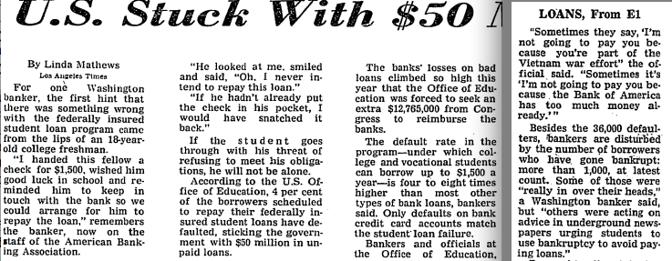But try telling that to anyone who'd been reading the papers! A typical syndicated dispatch on the surge in student deadbeats was the August 27, 1972 expose of Los Angeles Times reporter Linda Mathews, which began with the personal anecdote of an anonymous “Washington banker” who purported to have once “handed a $1500 check” for the year’s tuition to a nameless “18-year-old college freshman” only to be insouciantly told, “Oh, I never intend to repay this loan.” The kid was merely acting on the advice of “underground newspapers,” the anonymous banker—who had since joined “the staff of the American Banking[sic]Association”—helpfully explained.